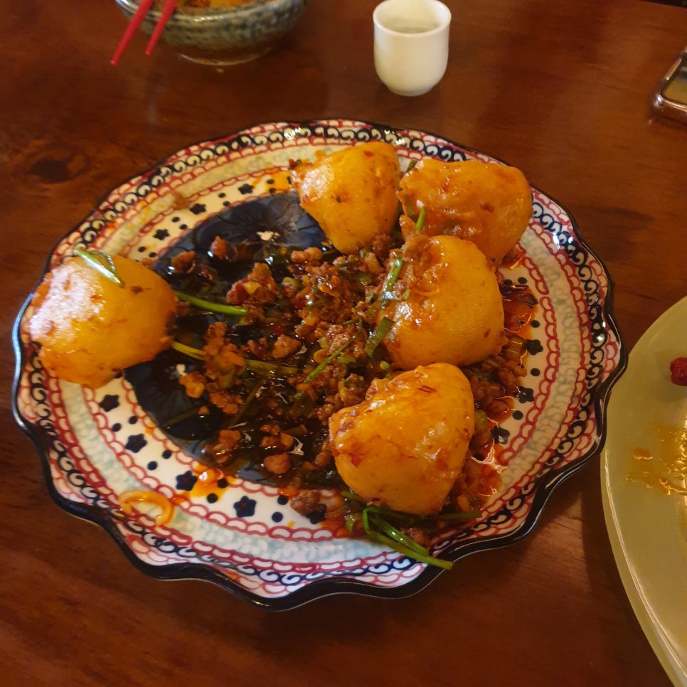 매끈한 튀김 속에 야들야들한 가지가 숨어있다. 그리고 주변엔 소스와 함께 다진 돼지고기가 부추와 야채와 함께 곁들여져 있다.