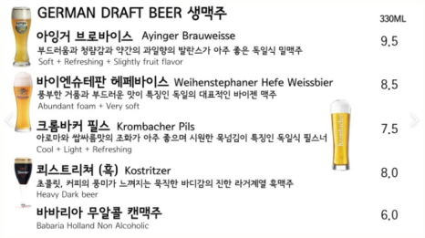 이 날은 독일마을 시그니쳐 맥주인 아잉거브로바이스 생맥이 아쉽게 없었다. 아잉거 브로마이스는 최근 수입 문제로 인해서 캔맥만 들어오는 상황이라고 한다.
