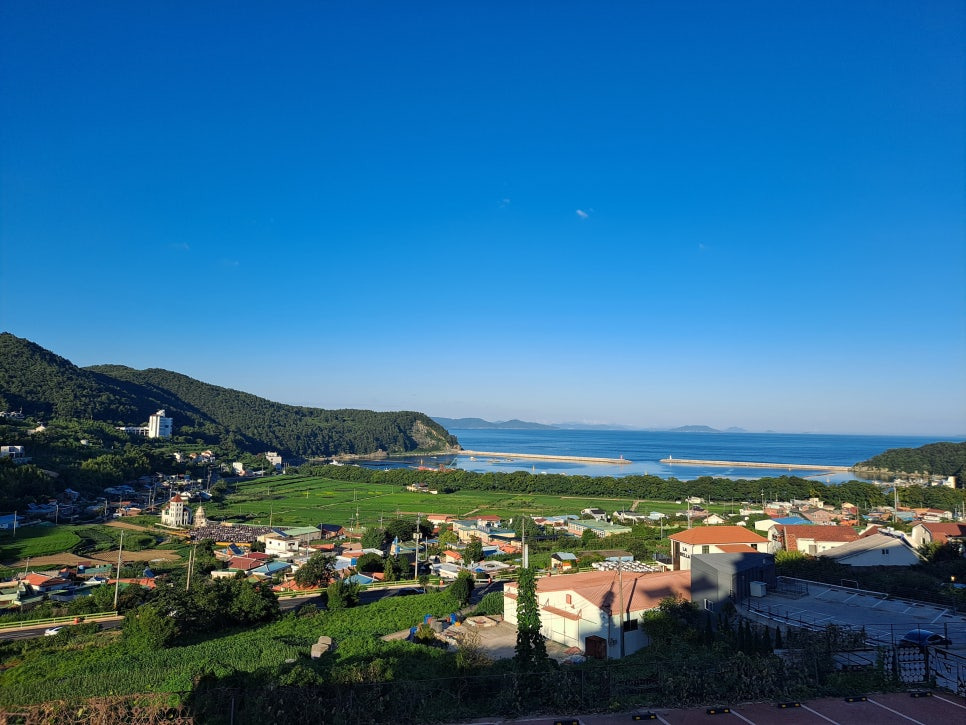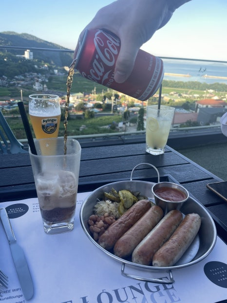 음식은 조리하는데 시간이 좀 걸려서 맥주부터 시켰다. 날이 밝아서 낮술같아 보이지만 저때가 이미 오후 5시 30분이었다. 하지만 밝은 날씨 덕분에 맥주와 함께 청량한 바다와 마음 편안해지는 녹색빛을 볼 수 있었다. 맥주마저 아름답게 만들어 버리는 저 모습