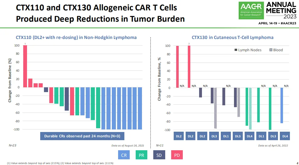 - CTX130: 고형 종양을 대상으로 한 임상 시험에서도 유망한 결과를 나타냈습니다. 종양 크기의 감소 및 일부 환자에서의 관해가 보고되었습니다.