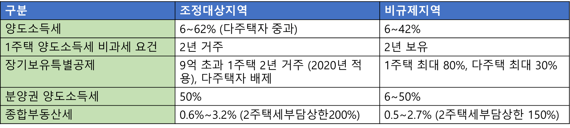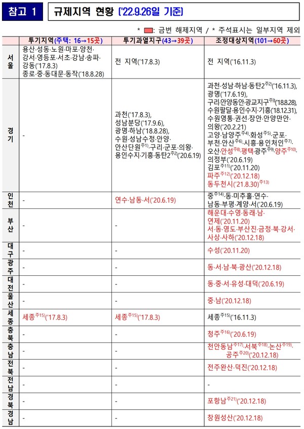 위 표를 보시면 투기지역, 투기과열지구, 조정대상지역이 나와있습니다. 이들의 차이는 다음에 설명토록 하겠습니다. 오늘은 간단히 투기지역, 투기과열지구, 조정대상지역 모두 조정대상지역이라고 생각하시고 보면 보기 편하실 것 같습니다.