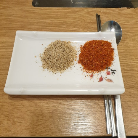우선, 이 곳에서 제공하는 양꼬치 소스를 먼저 언급하겠다. 기본으로 나오는 것은 우리가 자주 접하는 쯔란이고 그 옆에 흰색 소스는 추축컨데 들깨또는 깻가루에 소금이 들어가 있는 것 같다. 이 또한 맛있다. 하지만 아무래도 정통 소스는 쯔란이고 테이블에 큐민 (커민) 시드가 있다.