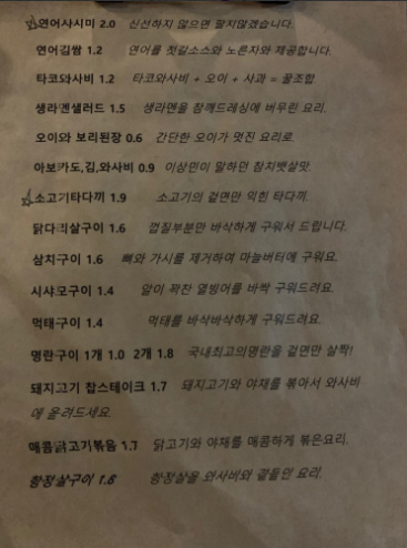 영업시간: 연중무휴 17:00~새벽 2:00 (월요일 휴무, 금,토 새벽 3:00까지)