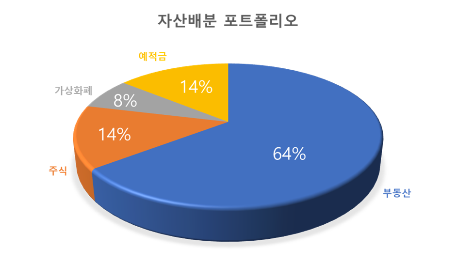 위 그래프는 리뷰인 의 자산분배현황입니다. 아무래도 나이가 많지 않다 보니 부동산 투자를 시작한 시점에서 부동산 투자가 굉장히 많은 부분을 차지하는 것을 볼 수 있습니다. 현재는 근로소득자 이기에 소득을 얻게 되면 주식과 가상화폐 등에 투자를 더 해서 부동산 비율을 50% 미만으로 줄이는 게 단기적인 목표입니다.