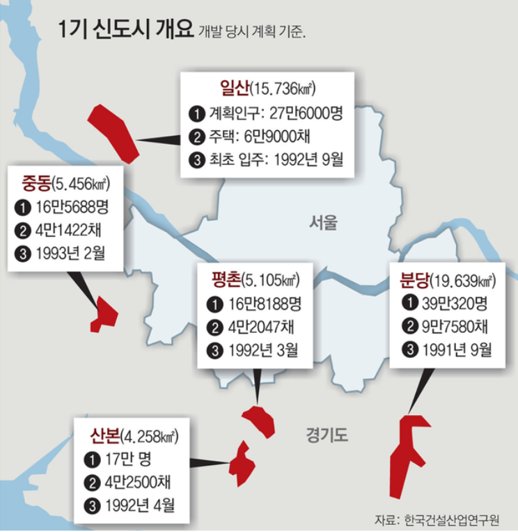 오늘은 이제 재건축 연한 (준공 30년)에 진입하는 1기 신도시에 대해서 알아보겠습니다. 우선, 1기 신도시라고 하면 분당, 일산, 중동, 평촌, 산본을 일컫습니다. 물론, 그 외에 여러 시, 군에도 더 있지만 이 다섯 곳이 핵심으로 진행되었기에 이 다섯 곳의 과거와 현재 그리고 미래를 알아보도록 하겠습니다.