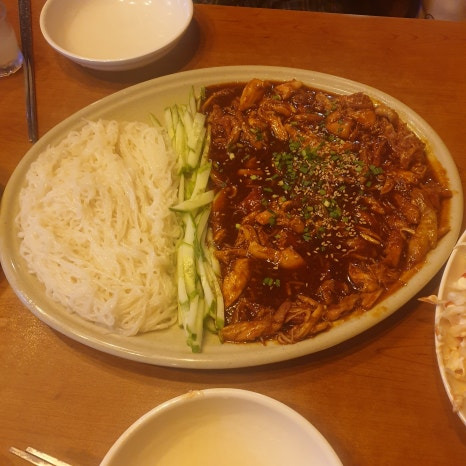 근데 이것들을 섞으면 따뜻하게 맵고달콤한 맛이 느껴질때 오이가 살짝 혀를 식혀주고 그 뒤를 따라오는 면이 혀를 쓸어주면서 목으로 함께 넘어간다. 혀를 쓸어줄때 담백함이 묻어나면서 먹고 나면 혀 끝에 매운 감이 돌면서 소주가 딱 땅기는 그런 ㅋㅋㅋ